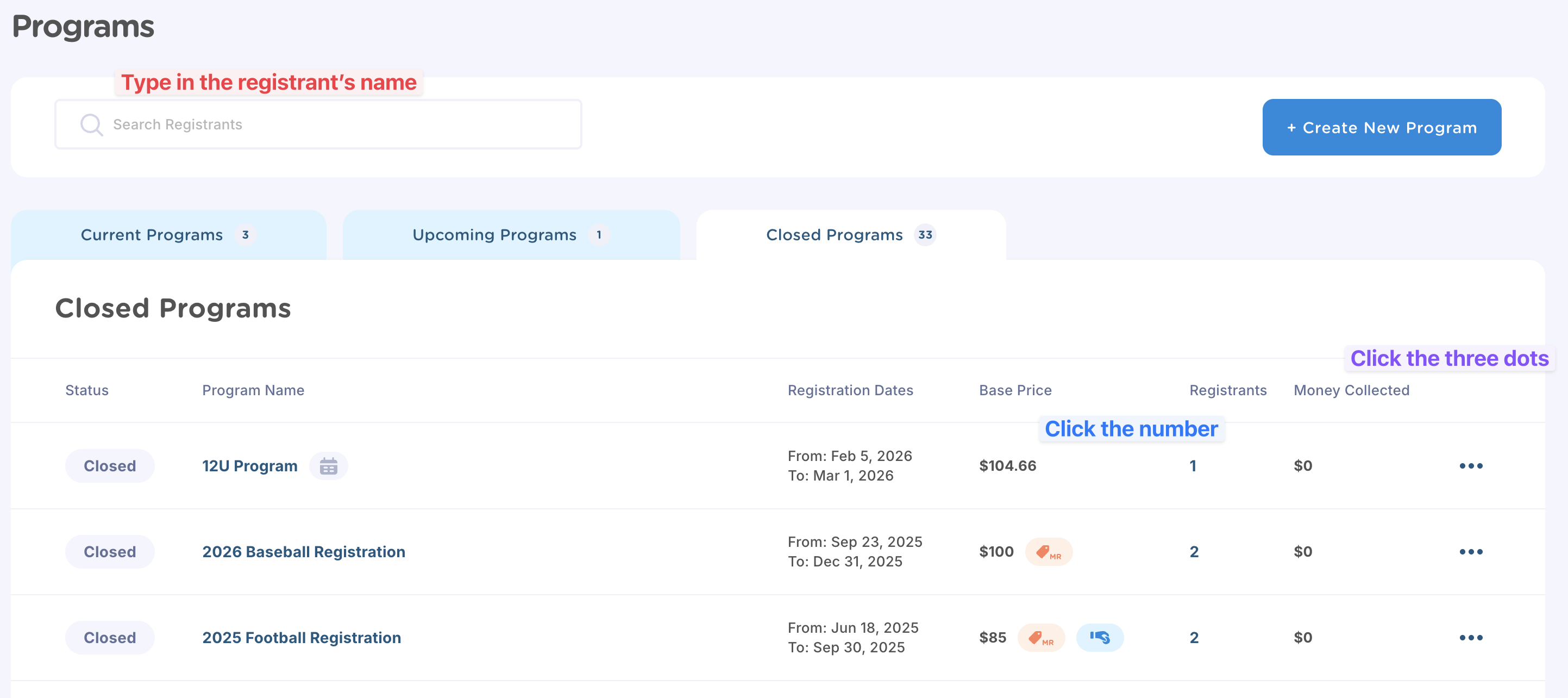 - Use the three dots on the right-hand side of the program and click View Registrants