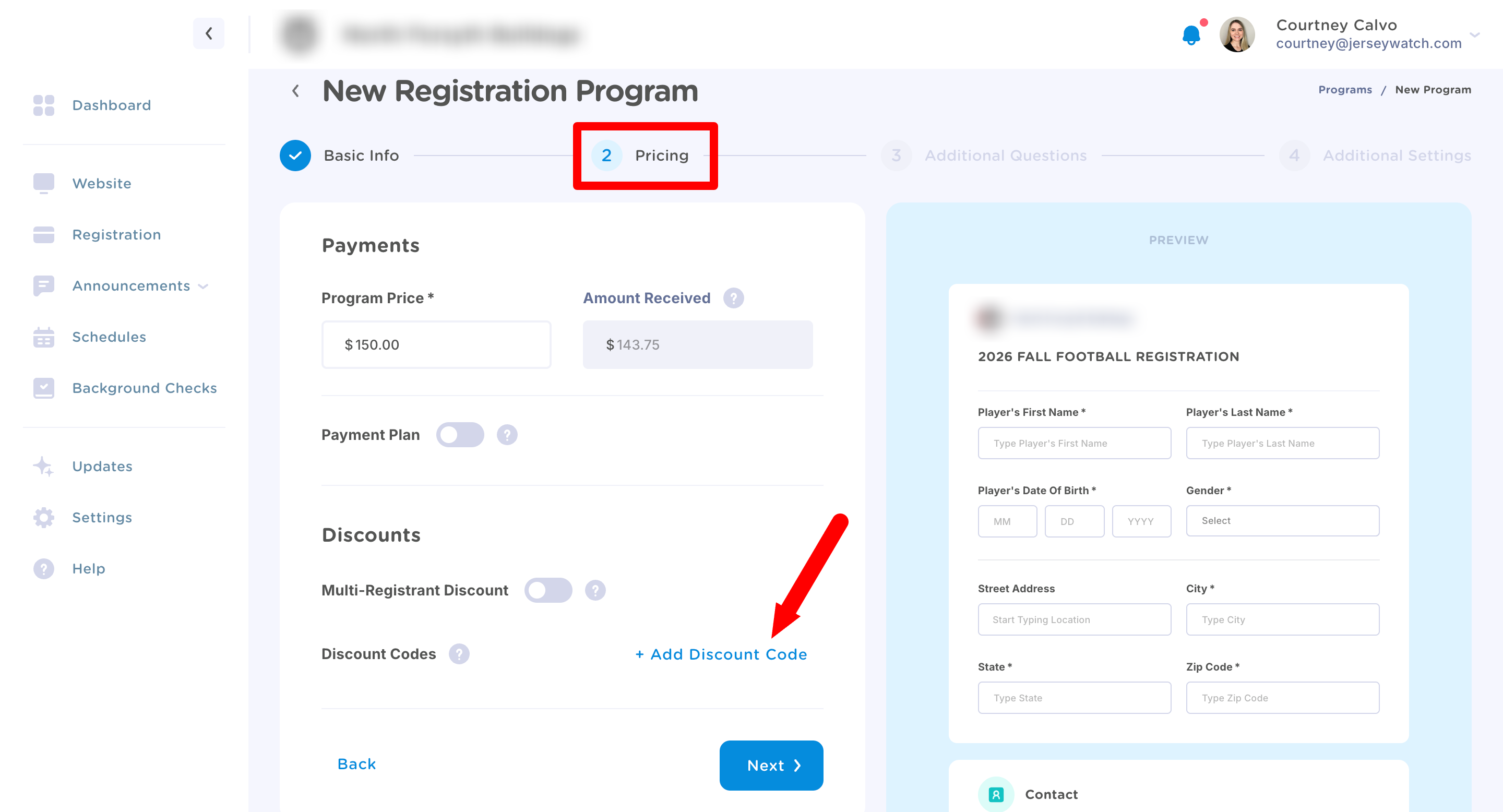 1. Go to your Programs Page and complete step 1 of building a new registration form.
