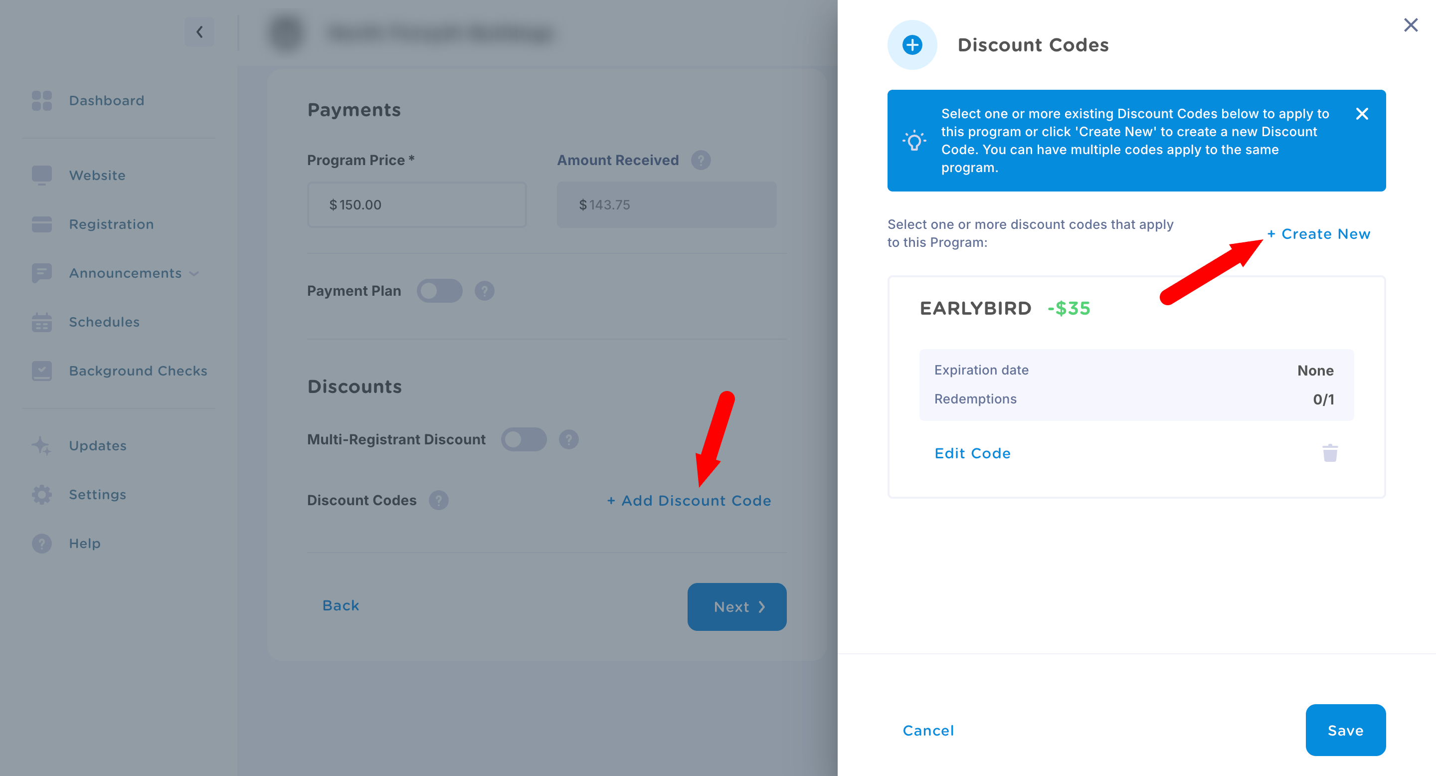 Discount codes let you lower the price of registration at checkout for certain registrants. You can set expiration dates, apply redemption limits, and use the same code across multiple programs.