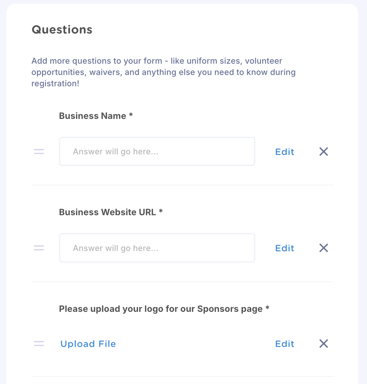 3. Add custom questions to collect additional information such as business name, logo and website address.