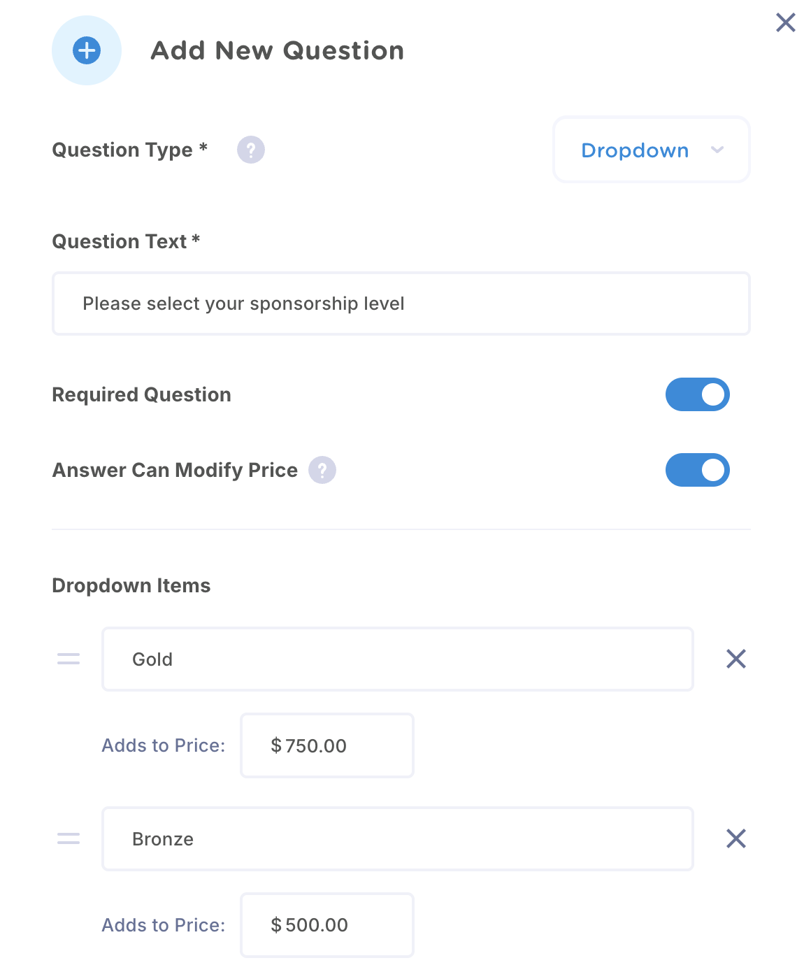 ✅ Important Note: If you have various sponsorship levels and pricing, use the dropdown question type and turn on the "Answer Can Modify Price" option. This will adjust the overall form price based on the option they select.