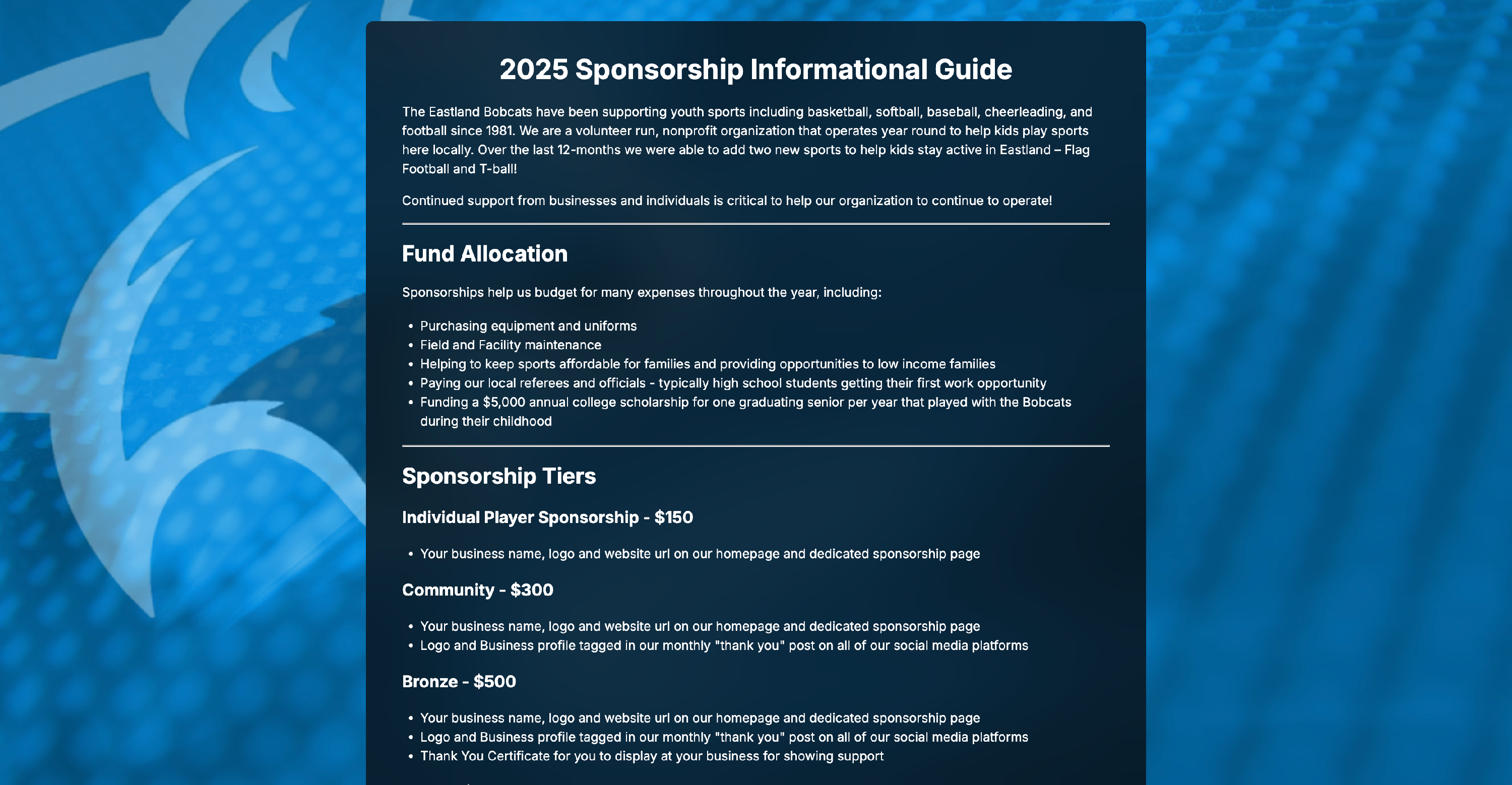 💡 Pro Tip: Create a custom page on your website with more information for prospective sponsors. You can add a direct link to your Sponsorship Form to make it easy for them to add their information and make a payment: