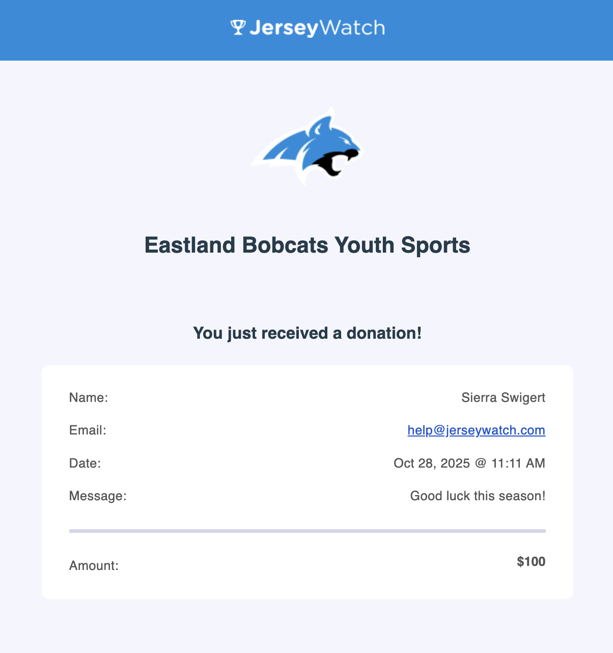 Once a donation has been made via the Donation Module on your homepage, you'll automatically receive an email with the donors name, their email address, the date/time that the donation was made, a personalized message (if one was sent), and the donation amount.