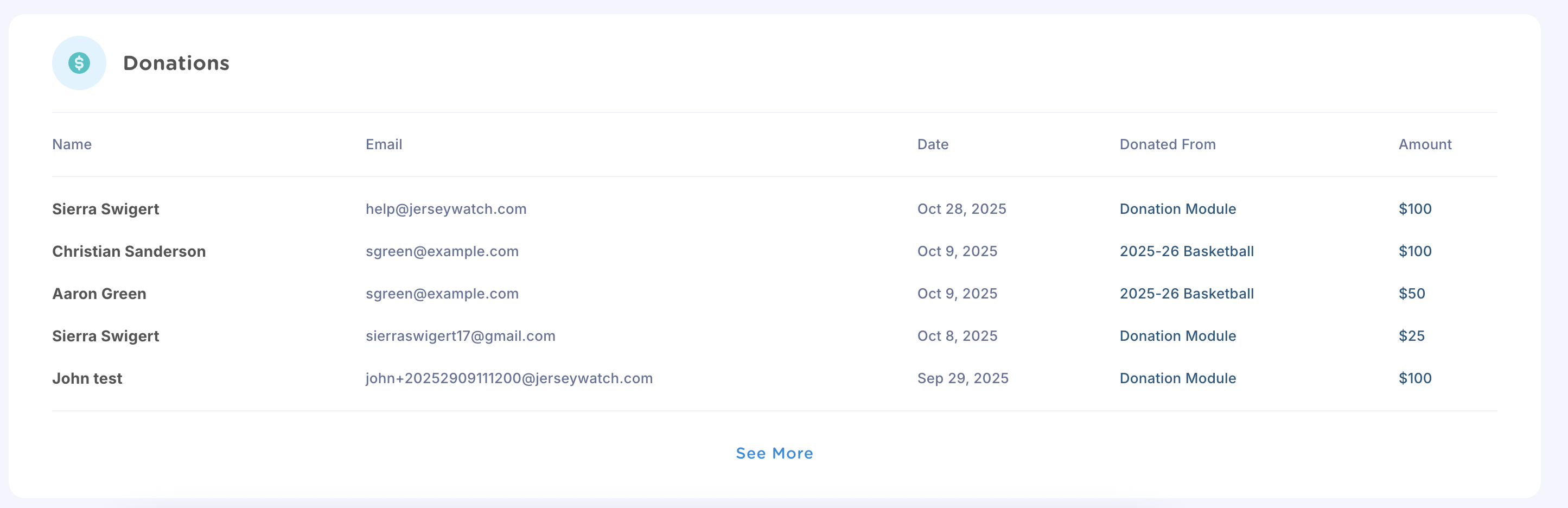Click the See More button to view all donations plus read any messages left through the Donation module.