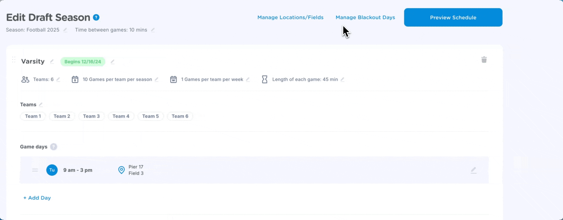Blackout dates are days when games shouldn’t be scheduled like holidays, school breaks, or times when your facility isn’t available. With the Schedule Generator, you can quickly set blackout dates for specific divisions and locations to avoid conflicts.
