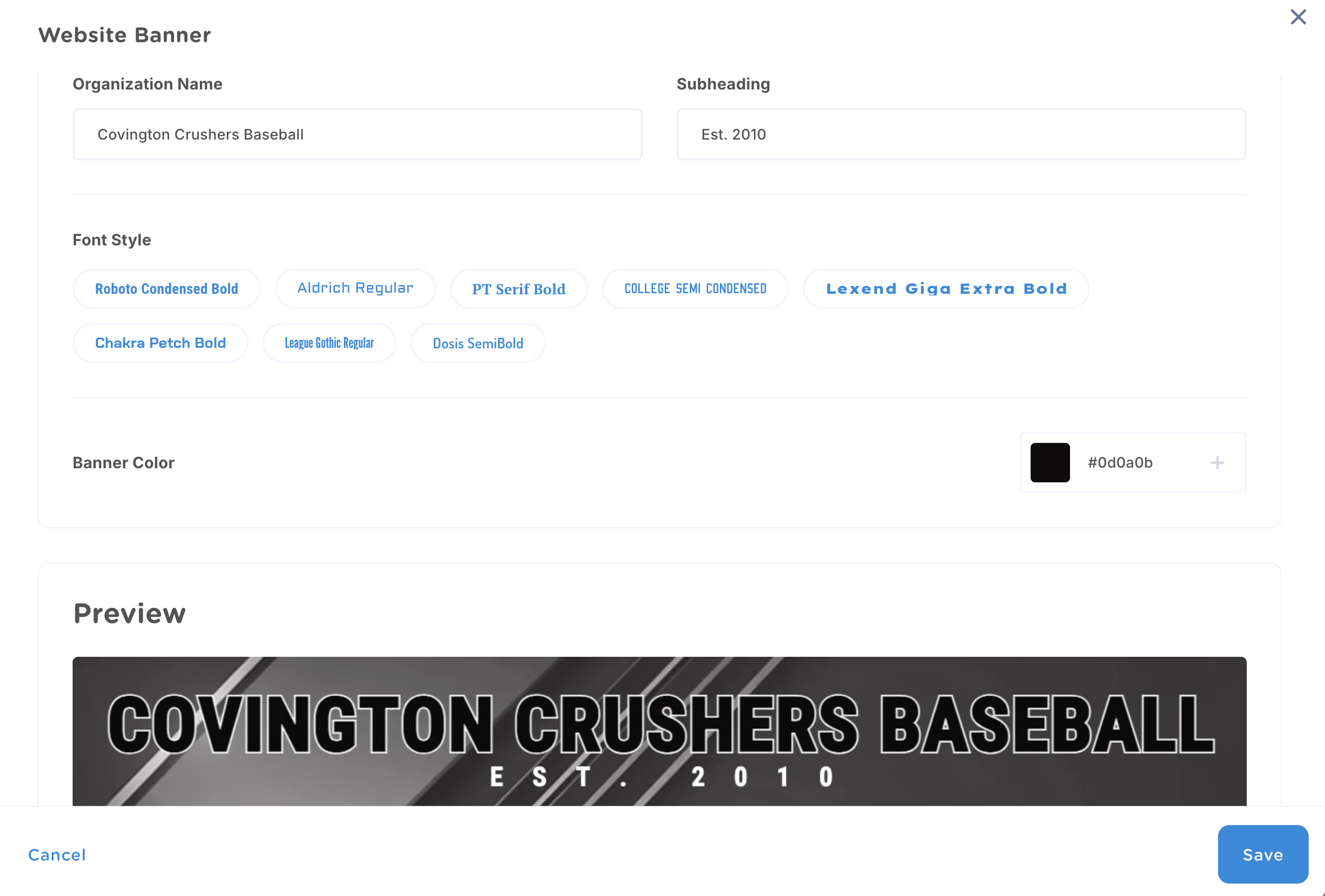 You can make changes to your organization name and subheading, choose a new font style, and update the text color. You will be able to preview the changes before saving.