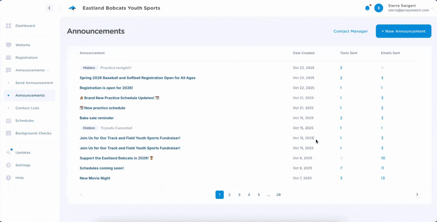 On the Announcements Page, you'll see a column for Texts Sent and another for Emails Sent. Each number represents an individual recipient who was sent your message. Click on each number to see a list of numbers and/or emails and their delivery status.