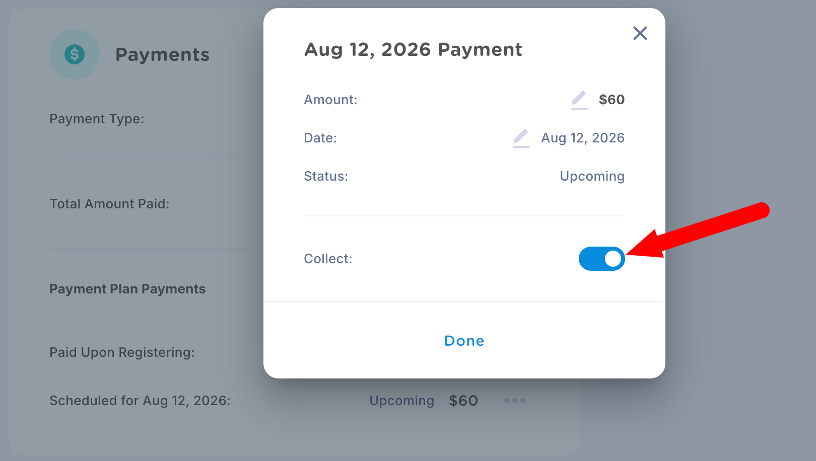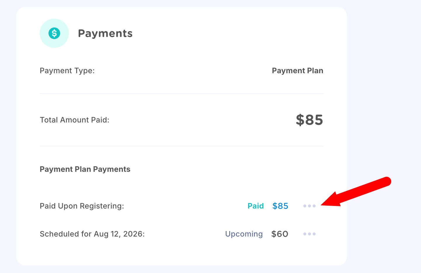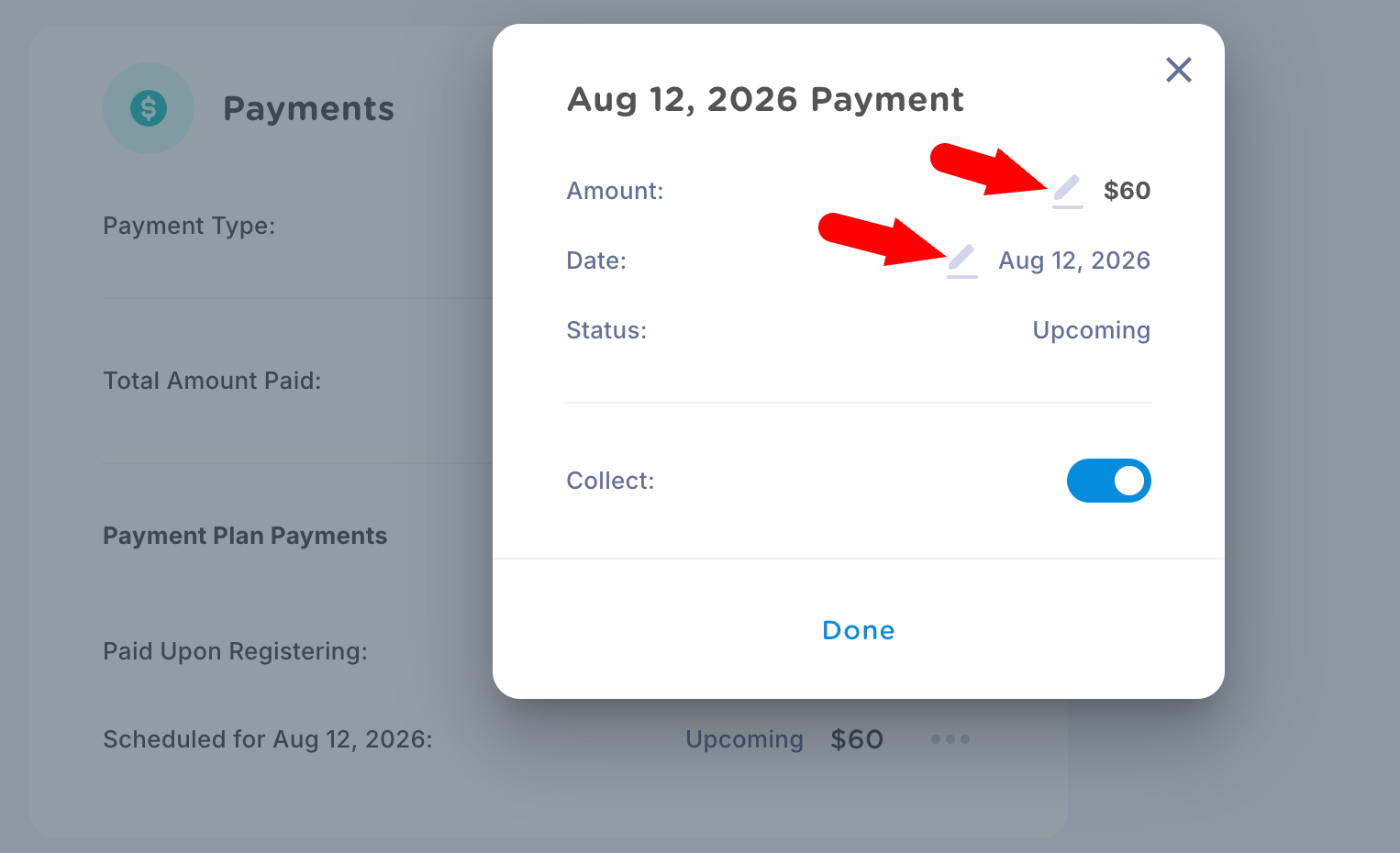 ⚠️ Important Note - you can push the date out, or decrease the amount owed. You aren't able to pull a payment forward, increase a payment plan installment, or add additional installments since the registrant agreed to specific conditions during the registration process.