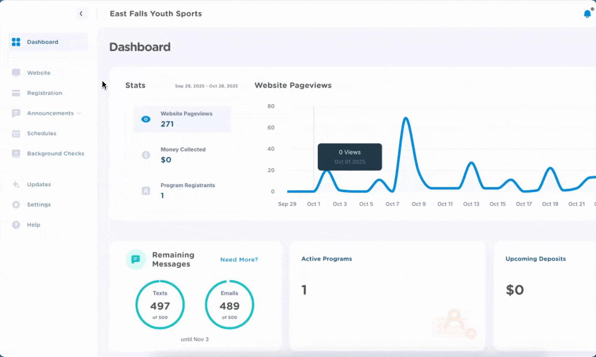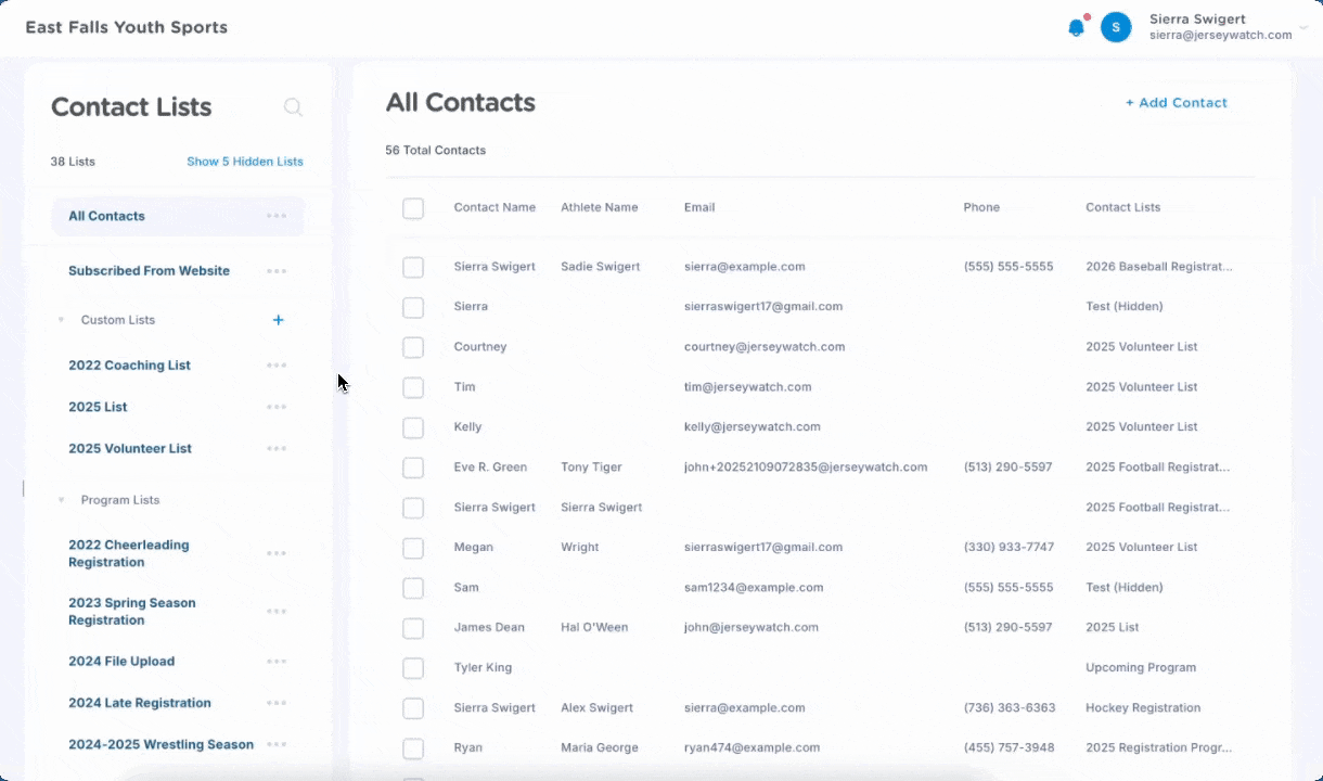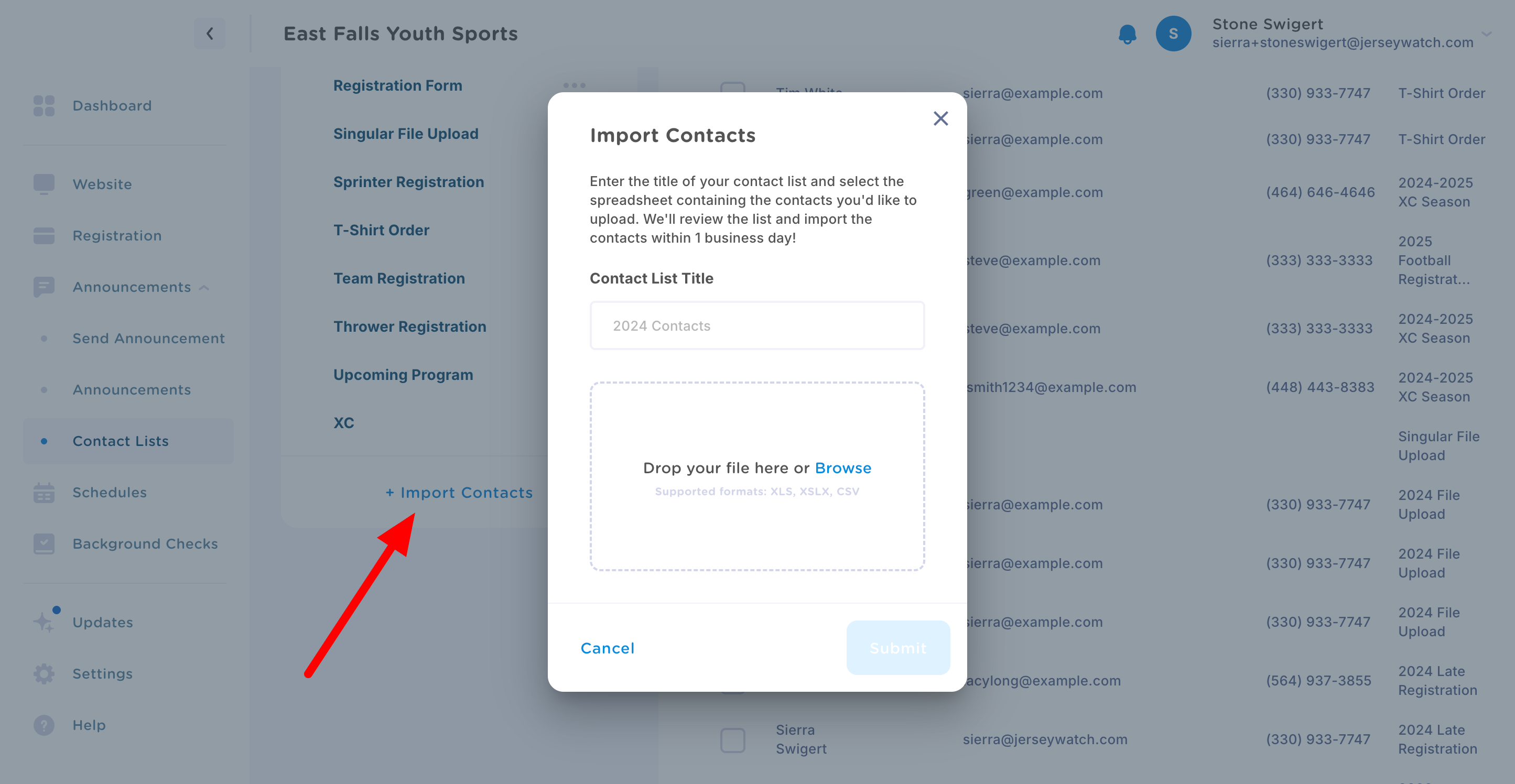 If you have many contacts from past seasons or events, our team can import them all at once. Just click +Import Contacts at the bottom of the column and upload an excel or csv file. Our team will review the information and reach out via email once the upload is complete.