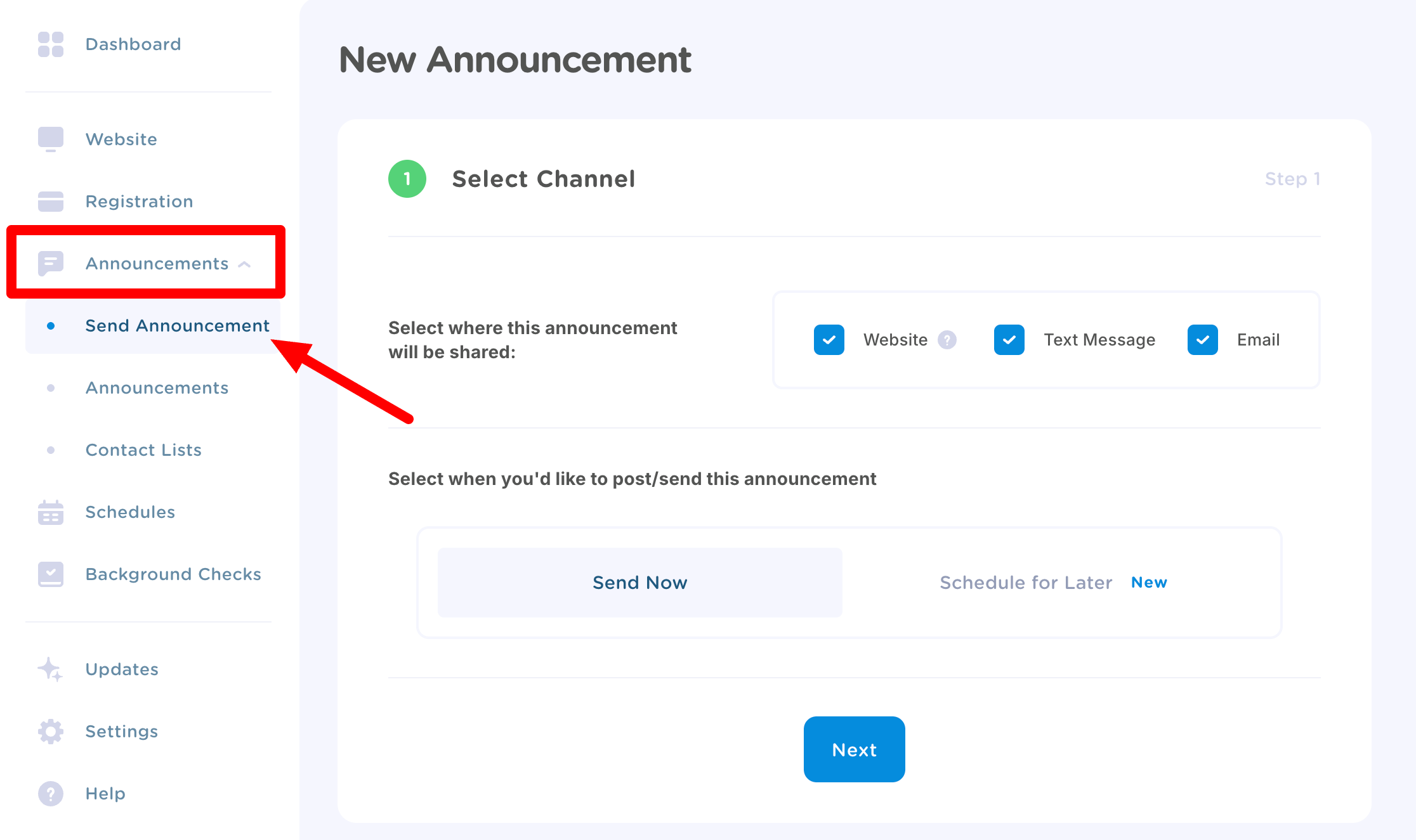 With our communication feature, you can create announcements that appear on your homepage and send them via text message and/or email - all from one place. Before you begin, click on Announcements in your side navigation and then select Send Announcement.