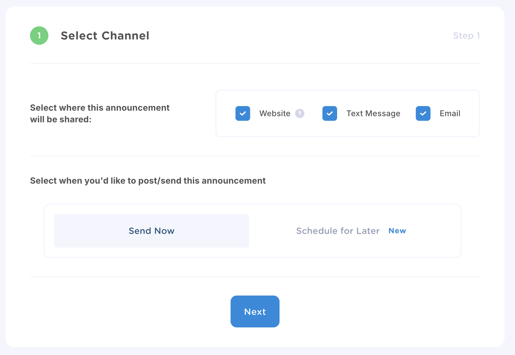 Select how you want your announcement delivered (homepage, text message, email, or a combination). If you’re on a current Plus or Pro plan, you can also choose a future date and time to schedule the announcement.