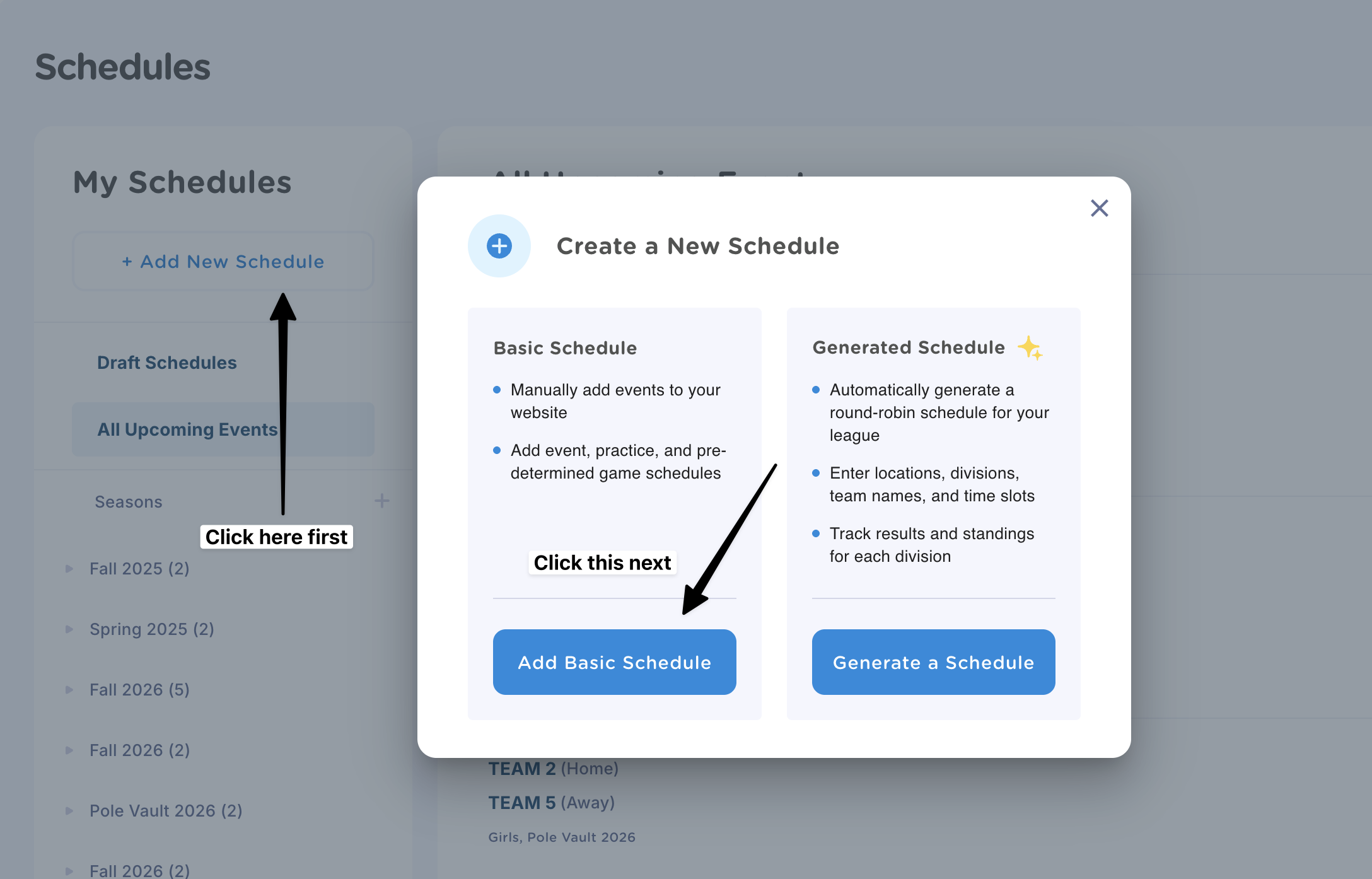 You can easily add predetermined schedules and events to your website to keep families informed and organized. The Basic Schedule option is perfect for events such as practices, fundraisers, parent meetings, and predetermined games.